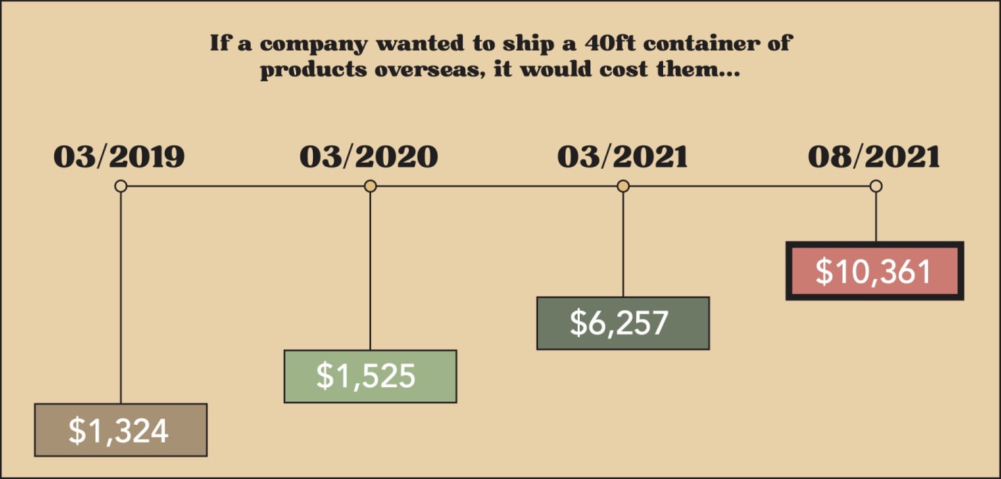 - By March 2021, after COVID effectively brought the shipping industry to its knees, the average price to ship a container jumped to a whopping $6,257.