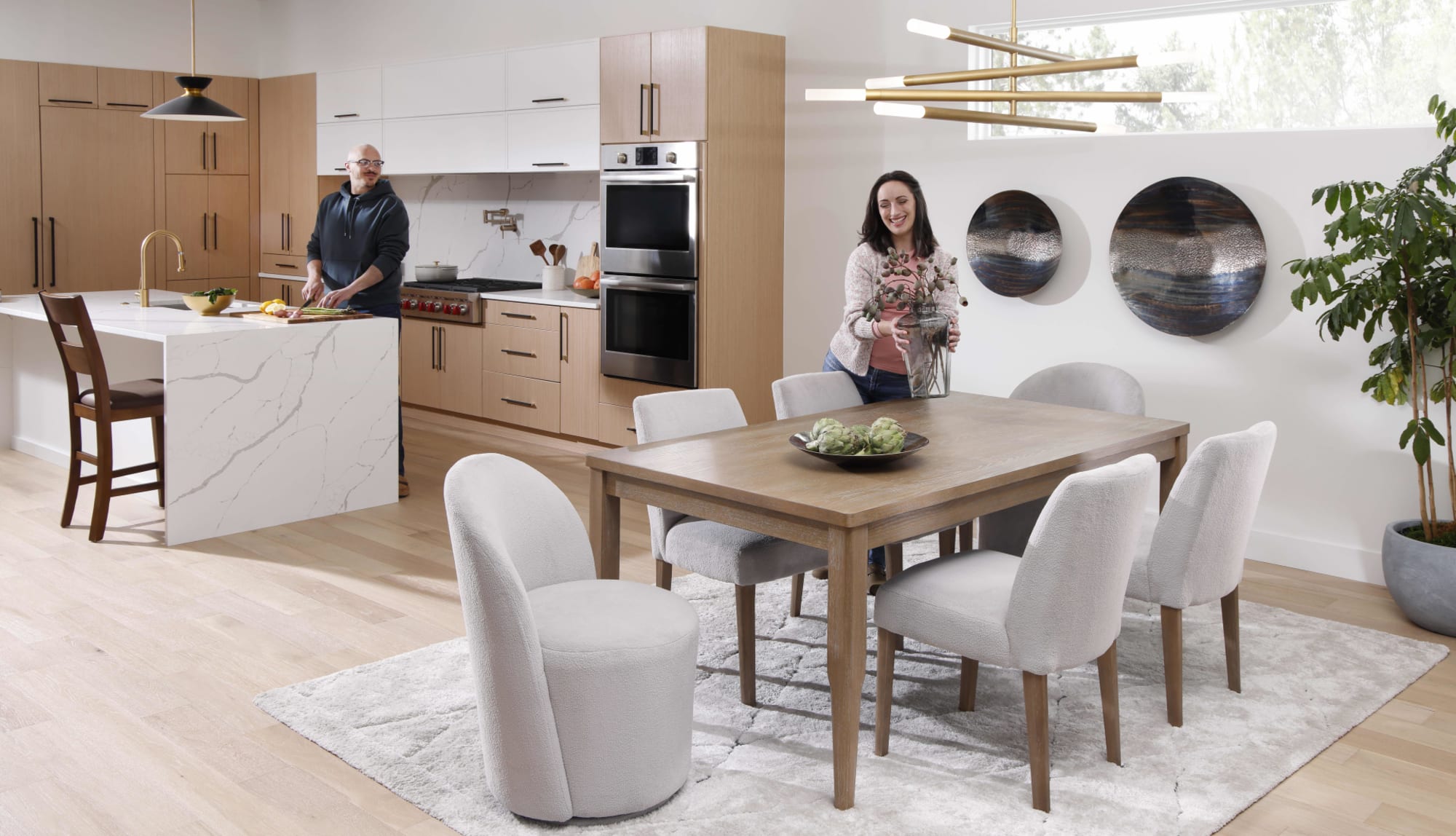 In the dining room, cocooning is less about sprawling seating and more about creating a calming, welcoming place to gather. Natural wood tones, round silhouettes, and upholstered seats work together to make meals feel slower and more intentional.