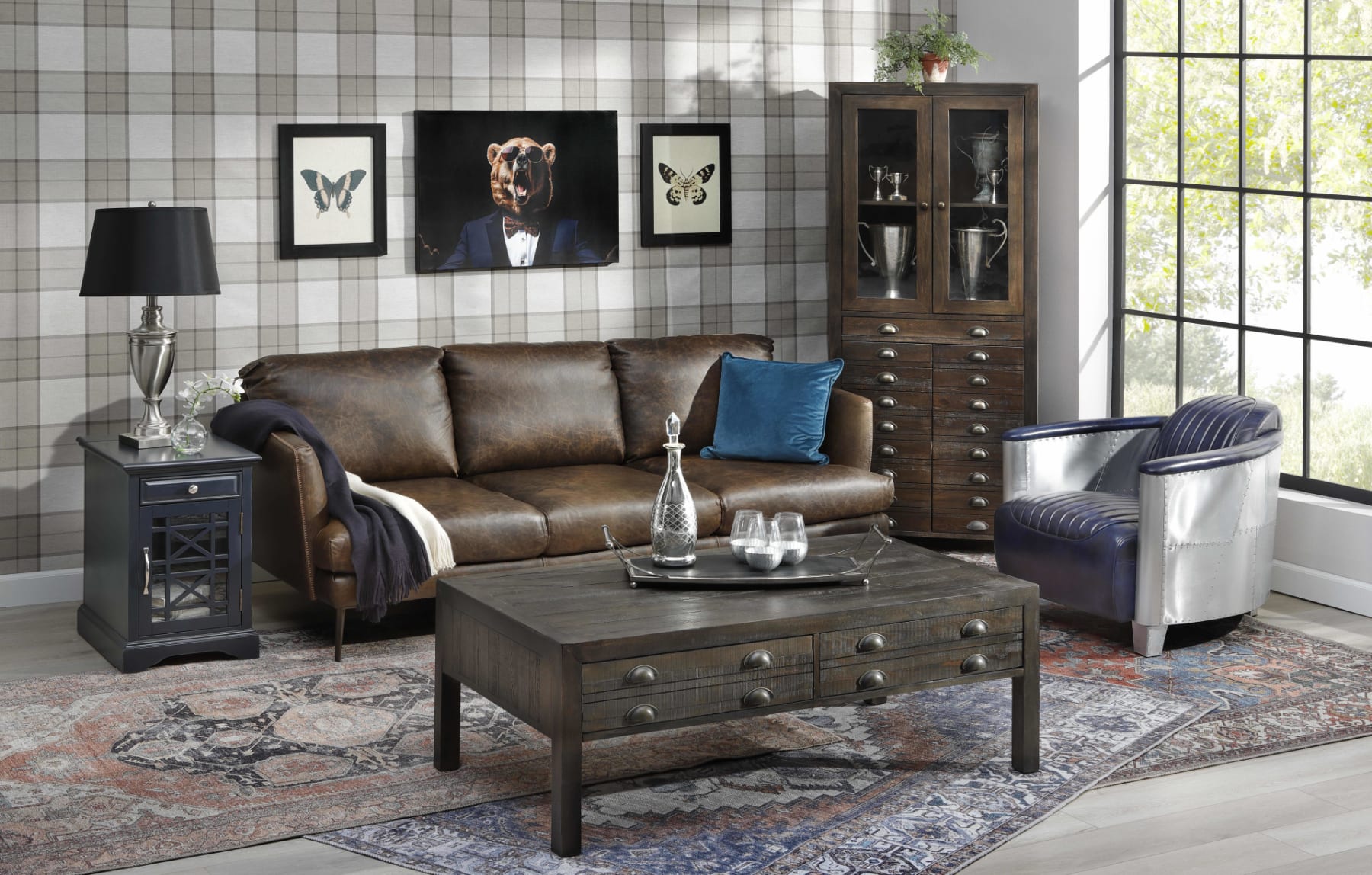 - Material: Echo materials like wood, marble, metal, or textured fabric across multiple items—think a walnut coffee table, leather accent chair with wood feet, and wood-framed mirror.