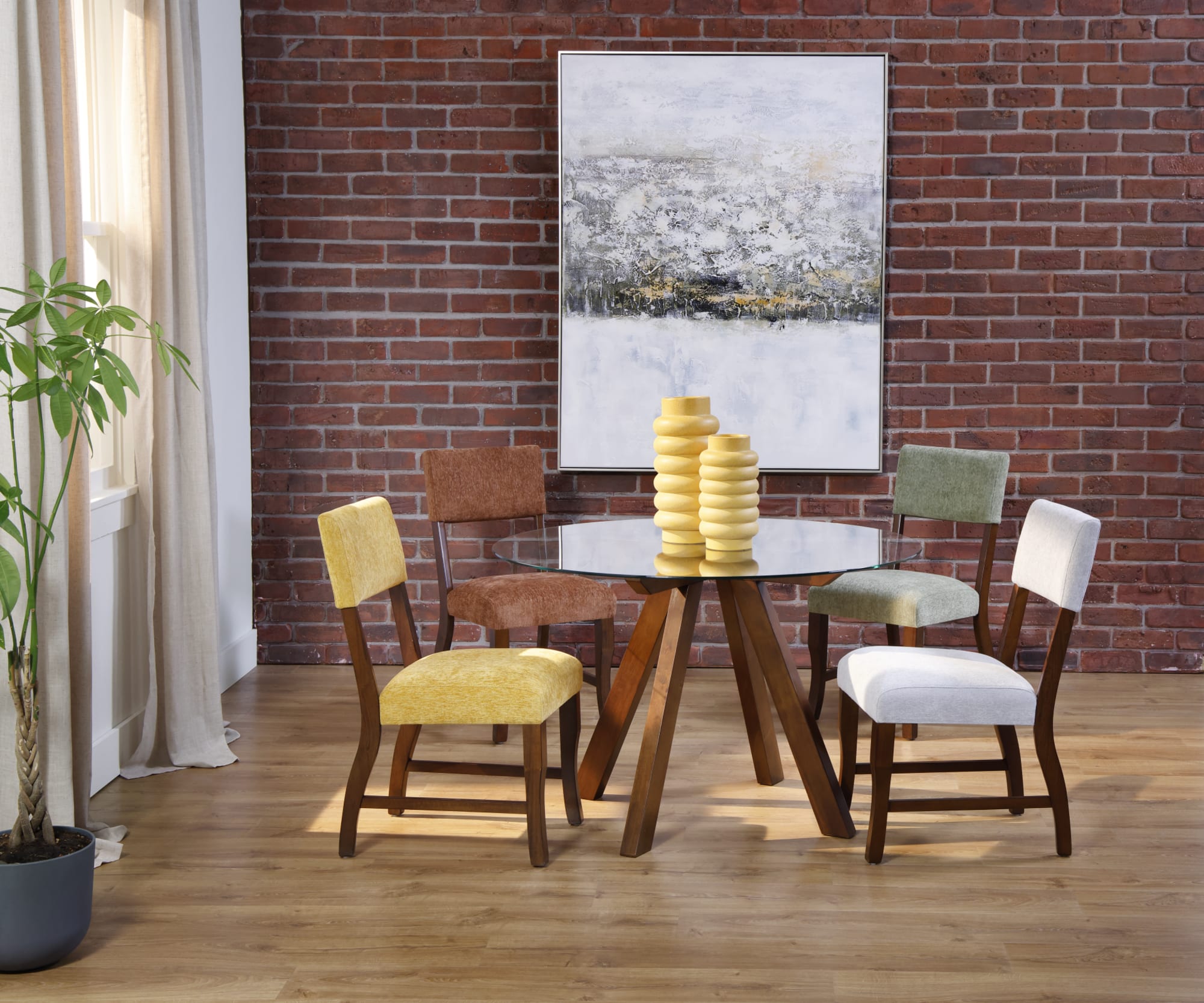 - A mid-century dining set with tapered legs paired with dining chairs in a mixed, unexpected upholstery color - terracotta, teal, or blush.