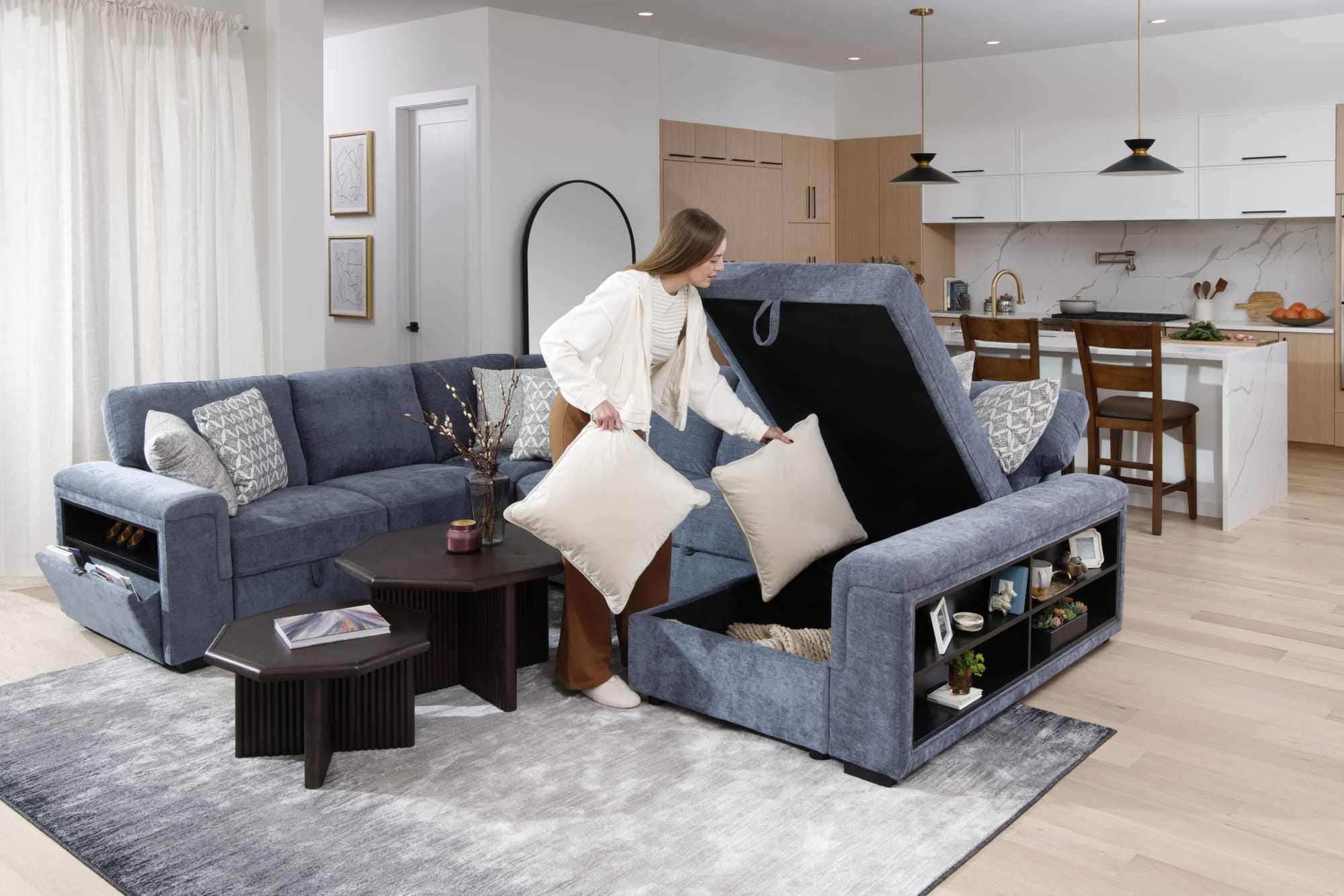 - Mid-century modern pieces with tapered legs for an artistic, intentional feel, or a curved sectional to break up rigid architectural lines.