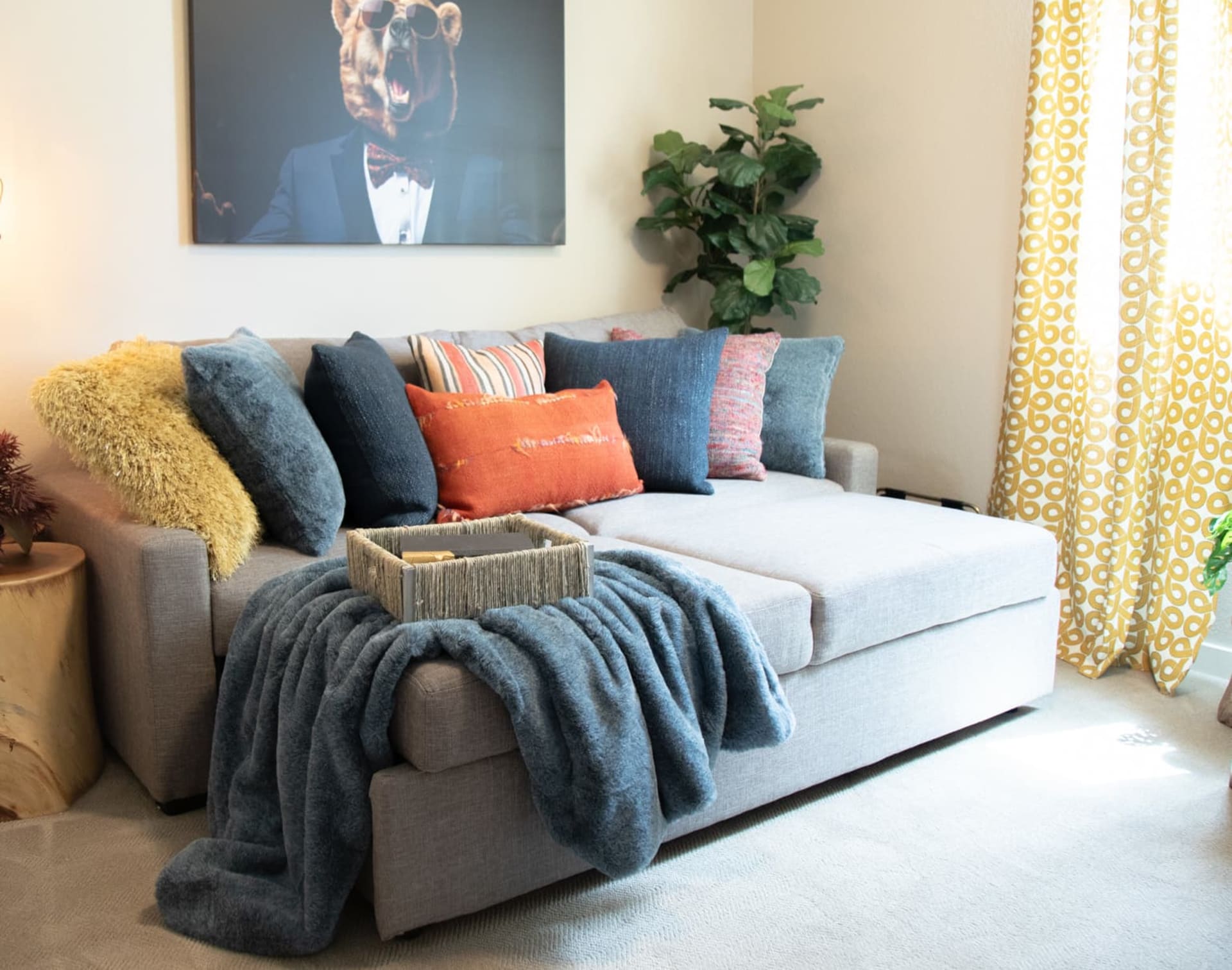 - A casual, comfy sofa in a versatile neutral tone, plus bright pillows and a playful rug to create a happy, lived-in lounge.