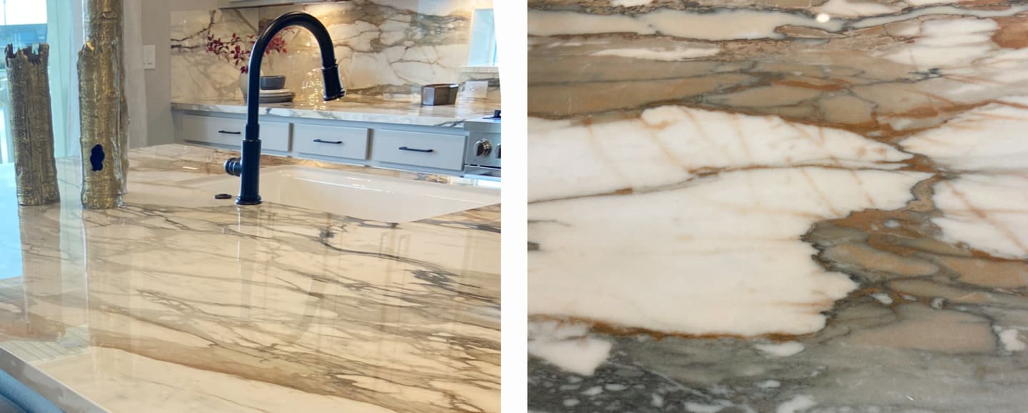 - The countertops - The countertops in the kitchen are just drop dead gorgeous. They look like beautiful marble slabs with swirls of earthy tans, browns, and grays - but they’re actually made of treated porcelain that’s much more practical than traditional marble. This porcelain is used for the countertops, the top of the large central island, and it’s used as the backsplash behind the countertops as well, which instantly gives the home a modern, high-end feel.