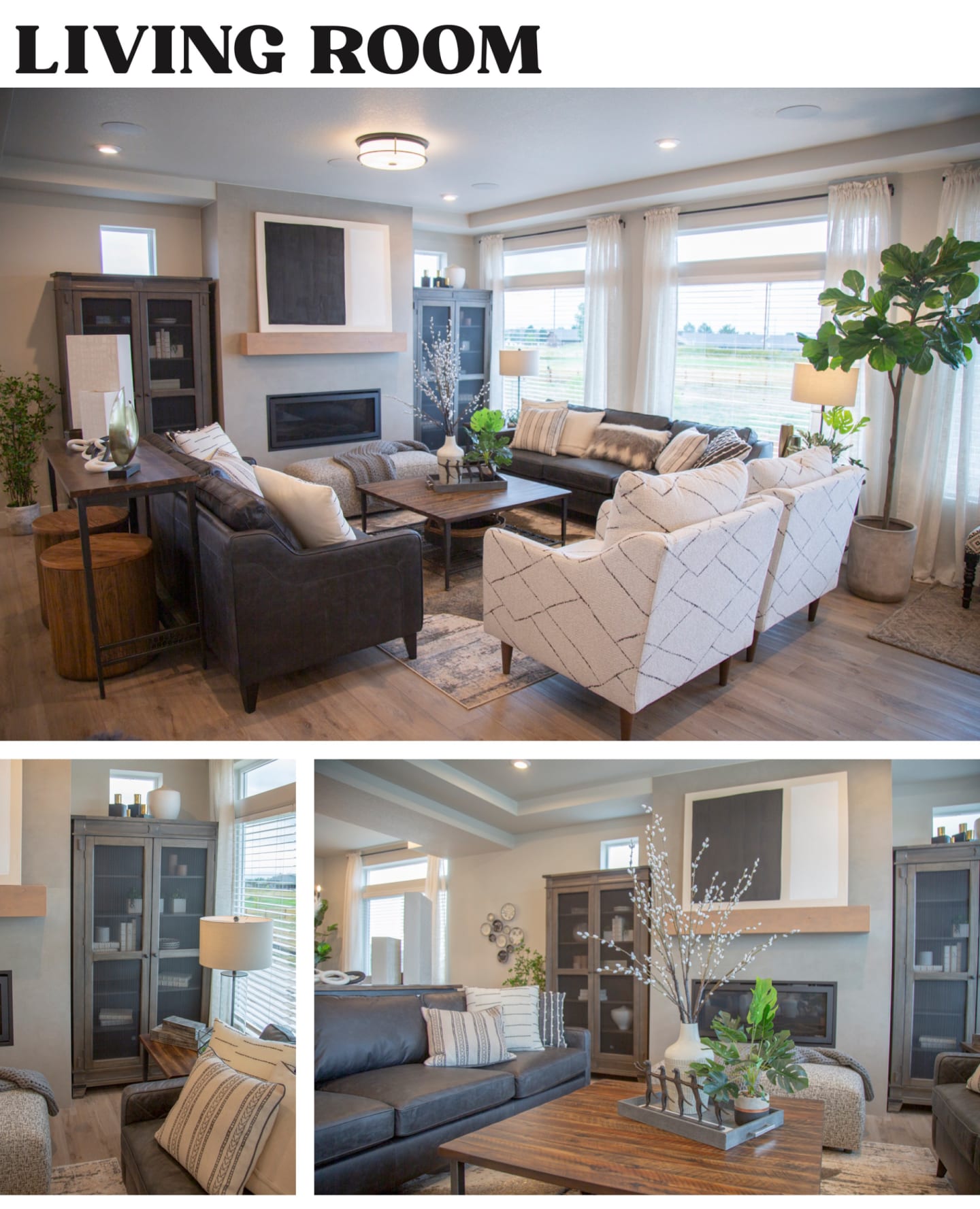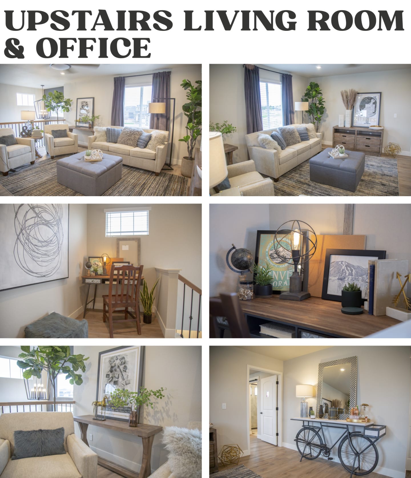 The next room I styled was the upstairs living room. The Nora Sofa and the Nora Chair were great pieces to start with because they’re new to Furniture Row and they offer a kind of a different take on the contemporary look. I took a similar approach in this space as I did the downstairs living room, so I wanted to find some occasional pieces with rustic influences. TheTheodore TV Stand, the Theodore Sofa Table, and the Theodore Round End Table worked really well for this with their planked tops and natural brown finish; then I was able to round out the design with the versatile Square Storage Ottoman as well as other accents and decor.