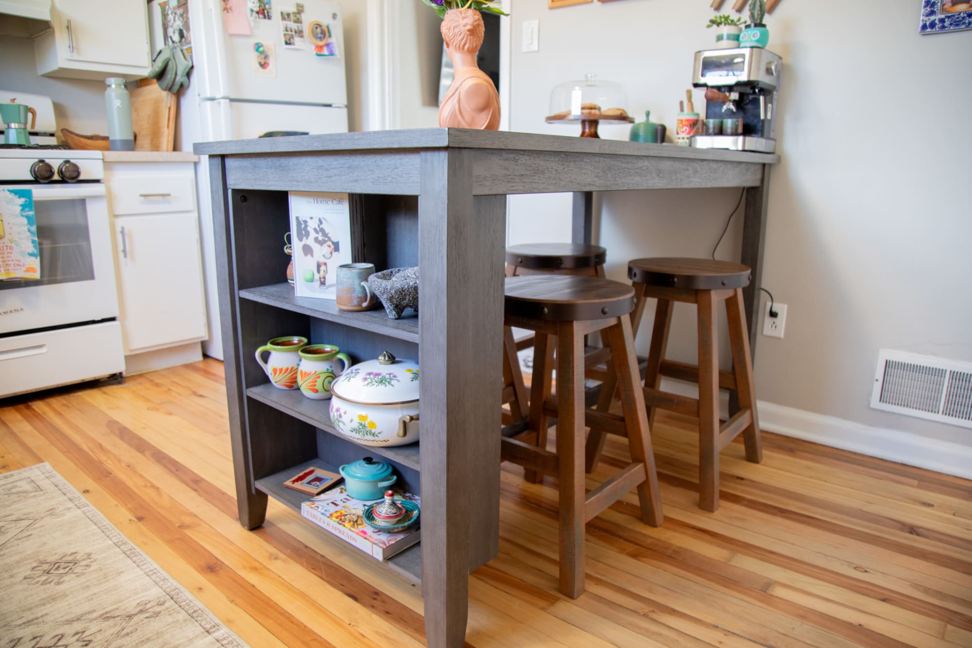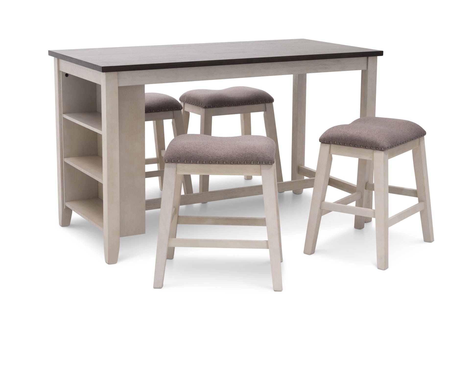 Small counter-height shelf tables tuck perfectly into breakfast nooks or entryways, offering storage for glasses, dish ware and decor.