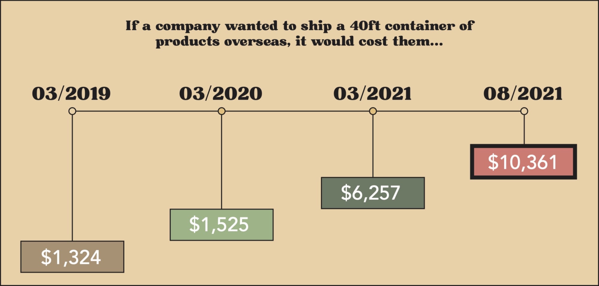 - By September of 2021, the average price to ship a 40ft container was a staggering $10,361, which is an increase of about 780% compared to the price in 2019.