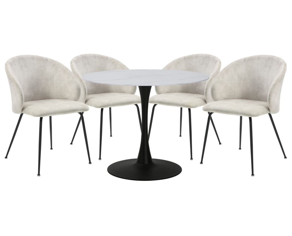Elevate your dining experience with the Kailua 5-Piece Dining Set. This modern set features a sleek, black metal tulip base that supports a stunning marble-print tempered glass tabletop. The white hue of the tabletop elegantly complements any dining room decor, creating a sophisticated and inviting atmosphere. Perfect for both everyday meals and special occasions, the Kailua Dining Set combines style and durability for lasting enjoyment. Upgrade your dining space with this chic and contemporary set today!