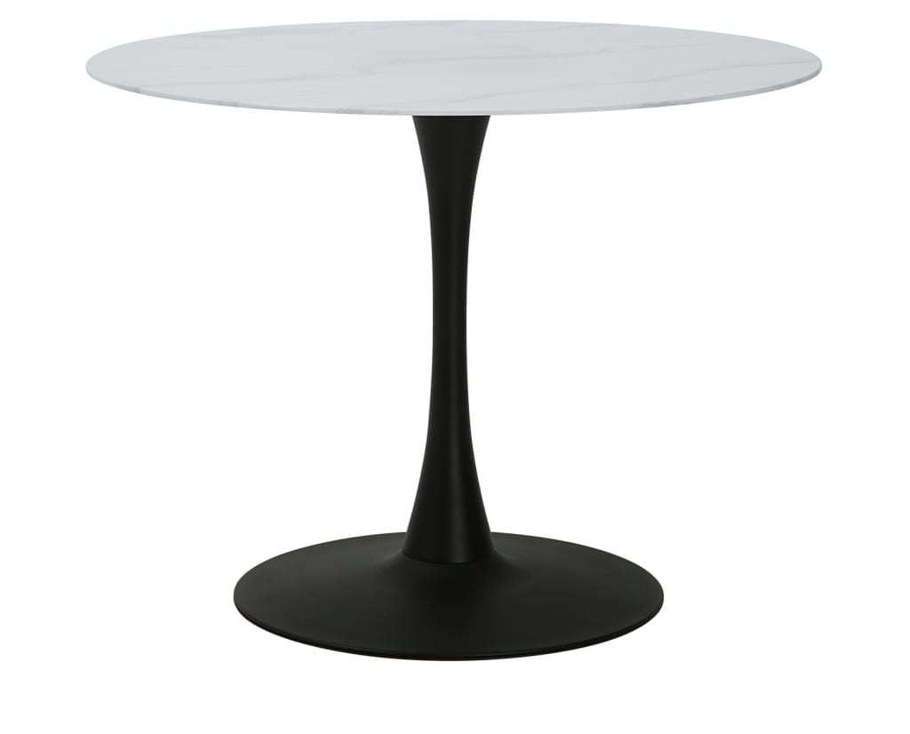 Elevate your dining space with the Kailua Dining Table. Its modern profile features a sleek black metal tulip base supporting a stunning marble-print tempered glass tabletop, creating an elegant and contemporary focal point for your dining room.