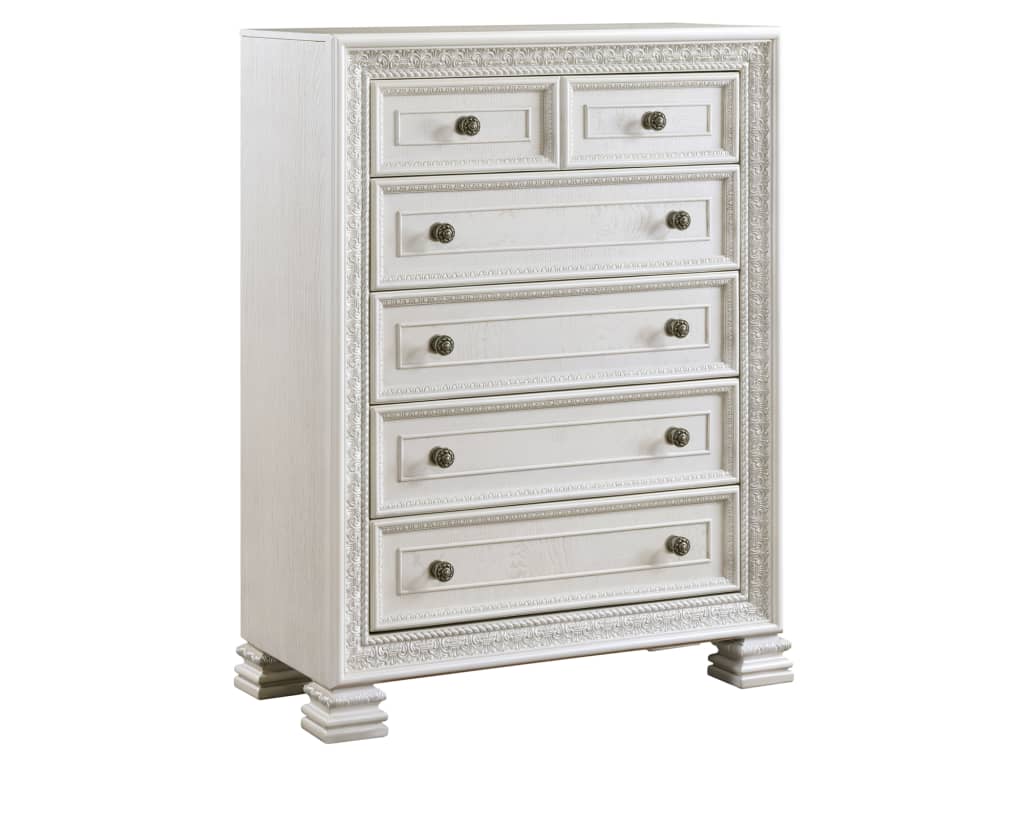 Modern Classicism meets elegant design in the Macy Chest. Old-world accents like egg and dart molding, acanthus detailing, and rope molding are enhanced by a modern pearl white finish over ash veneer. Detailed knob hardware completes this timeless piece, perfect for any bedroom.