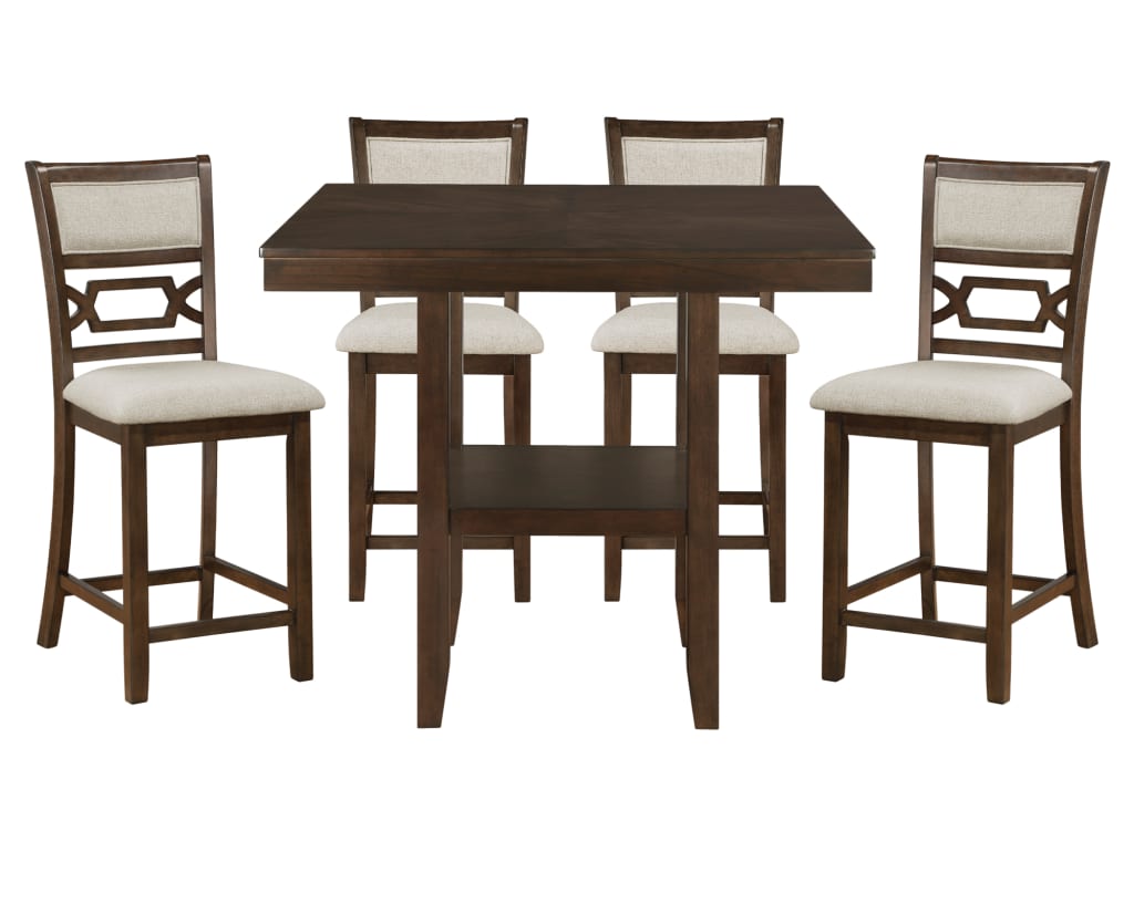Elevate your dining experience with the Sanderson 5-Piece Counter Height Set! Its subtle transitional design brings a casual yet sophisticated vibe to your dining space. The square counter height table boasts an open shelf base, perfect for showcasing your favorite decor. A rich, dark brown finish accentuates the natural beauty of the Mindy veneer. Complementing the table are wood-framed counter height chairs featuring a decorative back and comfortable beige textured fabric seating. Create a stylish and functional gathering spot with the Sanderson Collection!