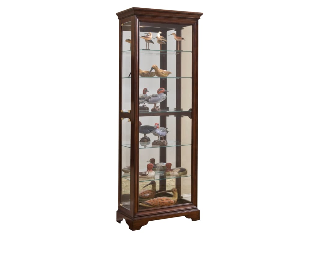 Illuminate and elevate your cherished collection with the Pulaski Accents 21308 Curio. This versatile curio cabinet, finished in a rich dark brown Gallery finish, is crafted from select hardwood solids and veneers. Showcase antiques or modern collectibles against a mirrored back, enhanced by high-low halogen lighting and five adjustable glass shelves. Traditional crown molding, a shaped base, and ogee foot add classic elegance to any room. Side entry provides easy access to your displayed items.