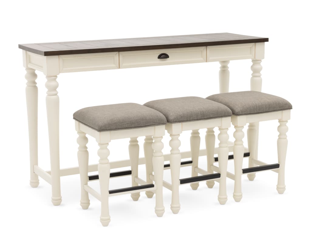 Infuse your living space with farmhouse elegance using the Jayla 4-Piece Bar Table Set. Gracefully turned legs and a charming two-tone ivory and mocha finish create an inviting ambiance, perfectly complementing farmhouse or cottage decor. Enjoy enhanced functionality with casters on the coffee table and a convenient bottom shelf for storage and display. Complete your unified living/dining area with matching sofa bar and dining sets.